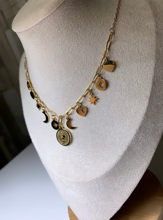 Collier pendentif Lune, infini, main, œil, perle blanche et fer à cheval
